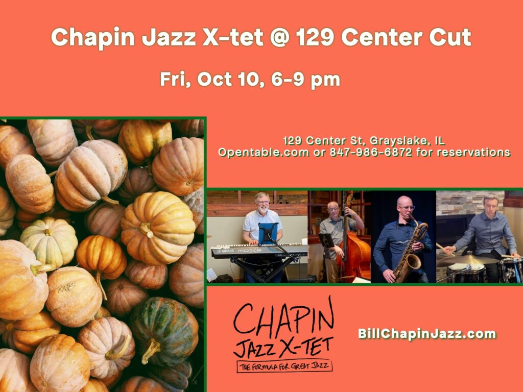 Welcome the fresh fall air with some jazz and great food at 129 Center Cut, from 6-9 pm on October 10th. The Chapin Jazz X-tet will be playing some autumn-themed tunes along with their regular mix of blues, swing, Latin, and contemporary jazz. Hear Bill Chapin on keys, Paul Nielsen on bass, Jim Richardson on drums, and Matt Karnstedt on bari sax.