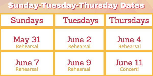 Rehearsal Dates: Sun May 31 | Tues June 2 | Thur June 4 | Sun June 7 | Tues June 9